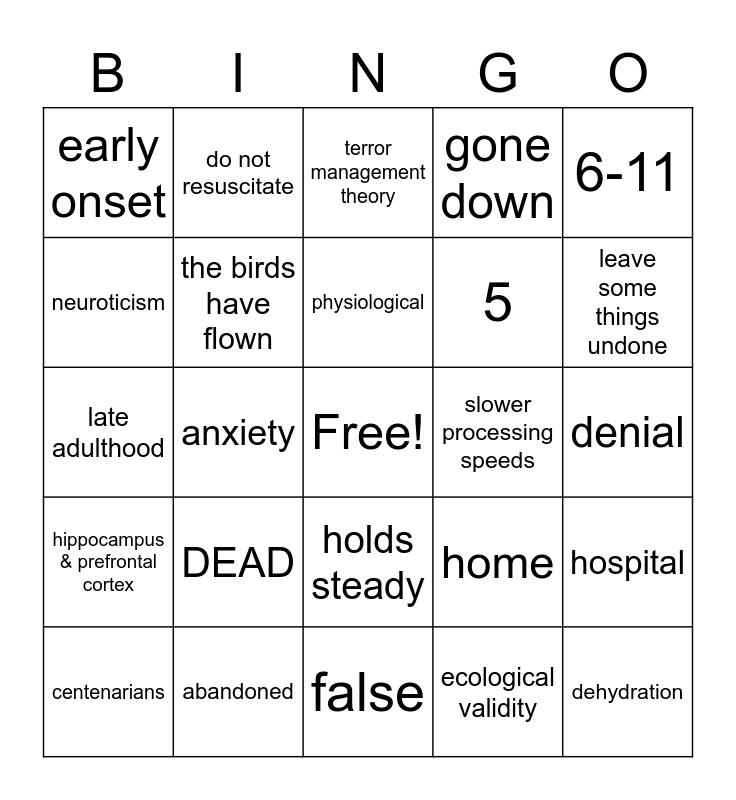 This bingo card has a free space and 35 words: 1/3, 15%, micro-aggression, the birds have flown, holds steady, gone down, neuroticism, self-transcendance, physiological, stagnation, late adulthood, 6-11, dopamine, stair steps, early onset, slower processing speeds, ecological validity, anxiety, hippocampus & prefrontal cortex, dehydration, home, centenarians, hospital, abandoned, terror management theory, leave some things undone, decrease, peaceful, 5, denial, pain, false, DEAD, do not resuscitate and turning off my respirator.