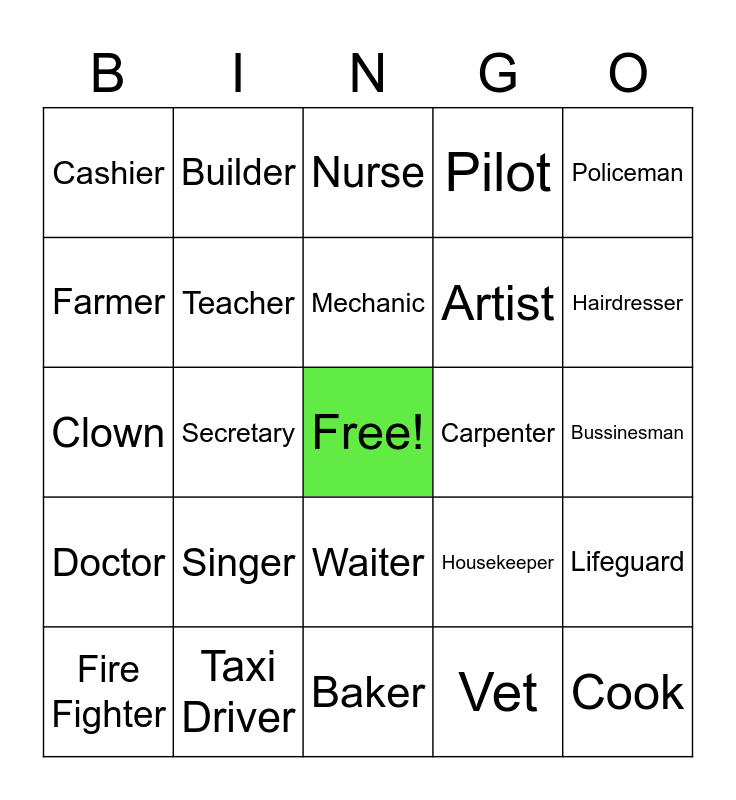This bingo card has a free space and 29 words: Fire Fighter, Dentist, Secretary, Gardener, Cashier, Nurse, Teacher, Singer, Carpenter, Taxi Driver, Bussinesman, Cook, Baker, Vet, Hairdresser, Student, Waiter, Doctor, Policeman, Clown, Housekeeper, Actor, Artist, Farmer, Pilot, Builder, Lifeguard, Mechanic and Paramedic.