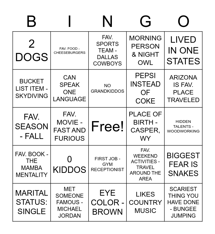 This bingo card has a free space and 25 words: MARITAL STATUS: SINGLE, 0 KIDDOS, NO GRANDKIDDOS, LIKES COUNTRY MUSIC, ARIZONA IS FAV. PLACE TRAVELED, 2 DOGS, FAV. FOOD - CHEESEBURGERS, FAV. SPORTS TEAM - DALLAS COWBOYS, PEPSI INSTEAD OF COKE, BIGGEST FEAR IS SNAKES, FAV. SEASON - FALL, CAN SPEAK ONE LANGUAGE, FAV. WEEKEND ACTIVITIES - TRAVEL AROUND THE AREA, SCARIEST THING YOU HAVE DONE - BUNGEE JUMPING, BUCKET LIST ITEM - SKYDIVING, MET SOMEONE FAMOUS - MICHAEL JORDAN, EYE COLOR - BROWN, MORNING PERSON & NIGHT OWL, HIDDEN TALENTS - WOODWORKING, FAV. BOOK - THE MAMBA MENTALITY, FAV. MOVIE - FAST AND FURIOUS, FIRST JOB - GYM RECEPTIONIST, PLACE OF BIRTH - CASPER, WY, LIVED IN ONE STATES and FAV. HOLIDAY - X-MAS.