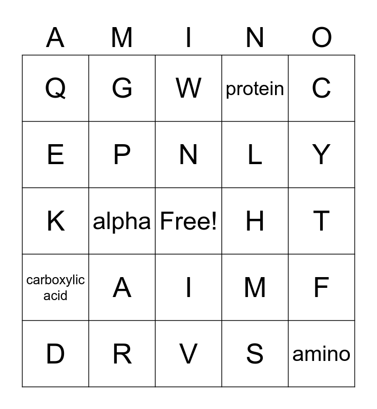 This bingo card has a free space and 24 words: A, R, N, D, C, Q, E, G, H, I, L, K, M, F, P, S, T, W, Y, alpha, amino, carboxylic acid, protein and V.