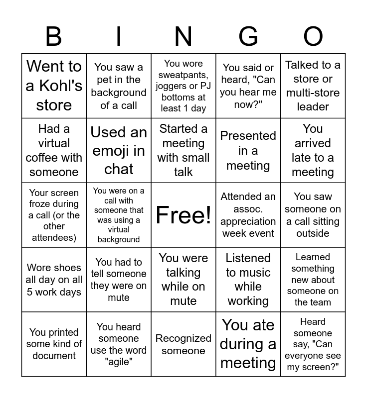 This bingo card has a free space and 24 words: You had to tell someone they were on mute, You heard someone use the word "agile", Started a meeting with small talk, You printed some kind of document, Talked to a store or multi-store leader, Went to a Kohl's store, Had a virtual coffee with someone, You saw a pet in the background of a call, Attended an assoc. appreciation week event, You were talking while on mute, Presented in a meeting, Your screen froze during a call (or the other attendees), Listened to music while working, Learned something new about someone on the team, Used an emoji in chat, You ate during a meeting, You saw someone on a call sitting outside, You wore sweatpants, joggers or PJ bottoms at least 1 day, You arrived late to a meeting, You were on a call with someone that was using a virtual background, Heard someone say, "Can everyone see my screen?", Wore shoes all day on all 5 work days, You said or heard, "Can you hear me now?" and Recognized someone.