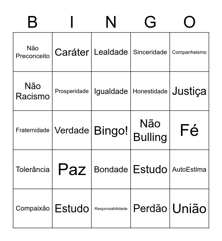 This bingo card has a free space and 24 words: Paz, Estudo, Igualdade, Compaixão, Companheismo, Não Preconceito, Não Racismo, Caráter, Não Bulling, Bondade, Honestidade, Fraternidade, Estudo, AutoEstima, Prosperidade, Perdão, Fé, Lealdade, Justiça, Verdade, União, Tolerância, Sinceridade and Responsabilidade.