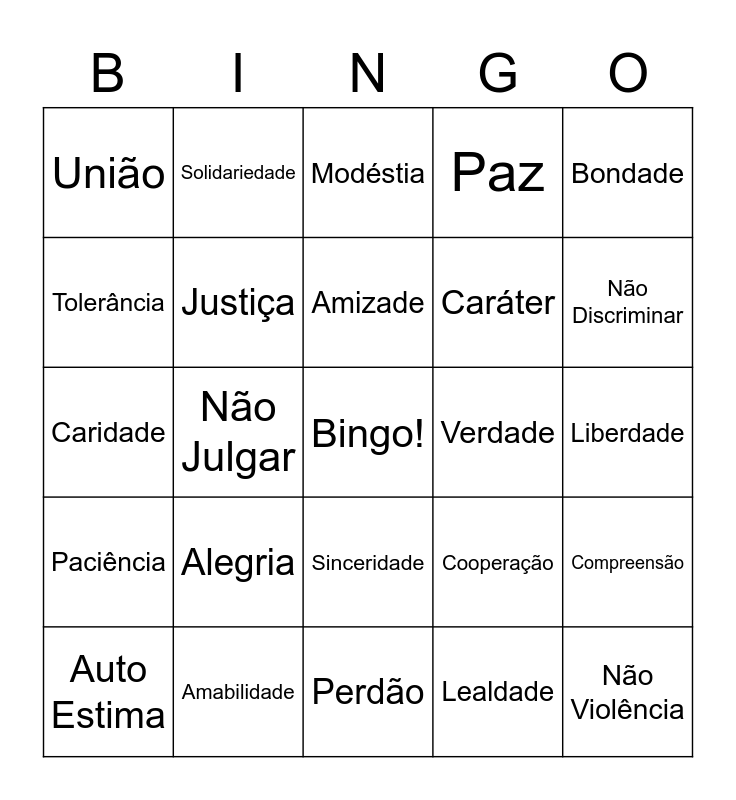 This bingo card has a free space and 24 words: Alegria, Amabilidade, Amizade, Auto Estima, Bondade, União, Tolerância, Solidariedade, Verdade, Sinceridade, Caráter, Caridade, Cooperação, Compreensão, Justiça, Lealdade, Liberdade, Modéstia, Não Discriminar, Não Julgar, Não Violência, Paciência, Paz and Perdão.