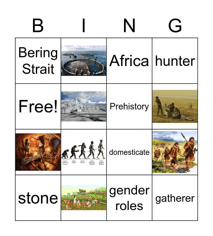 This bingo card has 7 images and 9 words: Africa, Bering Strait, domesticate, gender roles, Free!, stone, hunter, Prehistory and gatherer.
