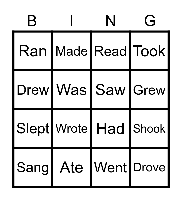 This bingo card has 16 words: Ate, Shook, Read, Ran, Slept, Made, Had, Went, Drew, Was, Sang, Took, Wrote, Grew, Saw and Drove.