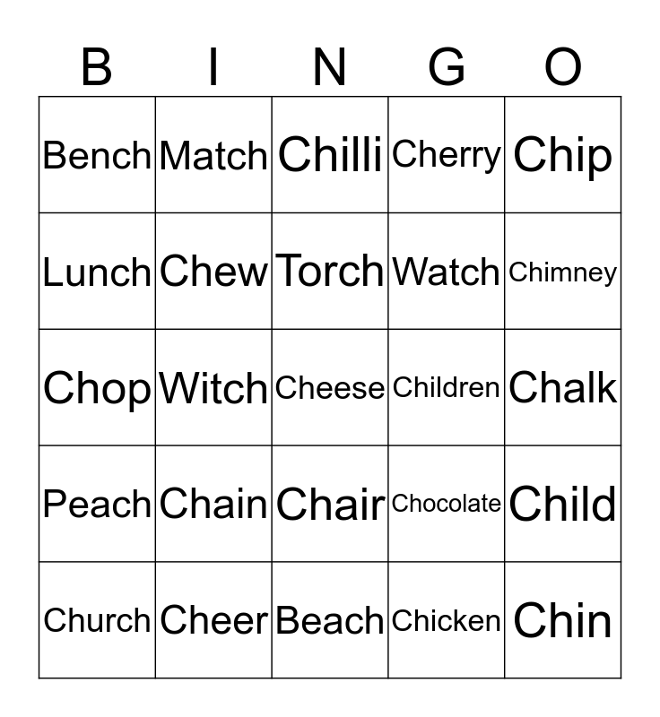This bingo card has 25 words: Chain, Beach, Torch, Church, Chip, Bench, Lunch, Match, Children, Chair, Watch, Chop, Chocolate, Child, Chew, Chin, Chalk, Chilli, Chimney, Witch, Cheese, Cheer, Peach, Cherry and Chicken.
