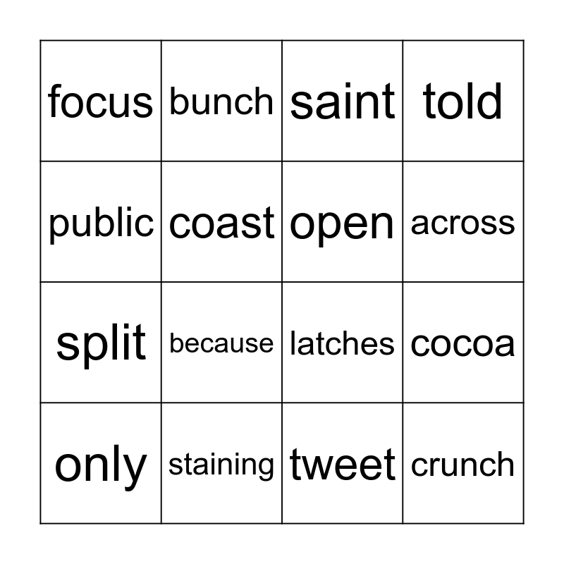 This bingo card has 16 words: staining, cocoa, saint, focus, split, bunch, latches, tweet, public, coast, only, told, because, across, open and crunch.
