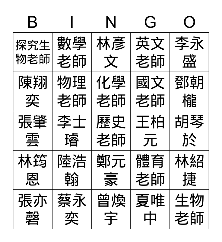 This bingo card has a free space and 24 words: 陸浩翰, 蔡永奕, 化學老師, 張亦磬, 李永盛, 探究生物老師, 陳翔奕, 數學老師, 王柏元, 鄭元豪, 國文老師, 張肇雲, 體育老師, 林紹捷, 物理老師, 夏唯中, 胡琴於, 林彥文, 鄧朝櫳, 李士璿, 生物老師, 林筠恩, 英文老師 and 曾煥宇.