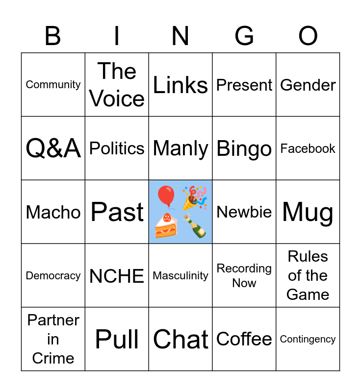 This bingo card has a free space and 41 words: Birthday, Macho, Rodeo, Politics, Pull, Masculinity, Manly, Feminine, Gender, Democracy, Past, Present, Contingency, Mug, Newbie, NCHE, After Party, Community, Podcast, Links, Rules of the Game, Grace, Chat, Bingo, Week/Episode count, Poof!, Coffee, Karalee, Facebook, Joanne, Statement necklace, The Voice, Partner in Crime, Background, Recording Now, Q&A, Hamilton, Heather, Voting, Cowboy and Western.