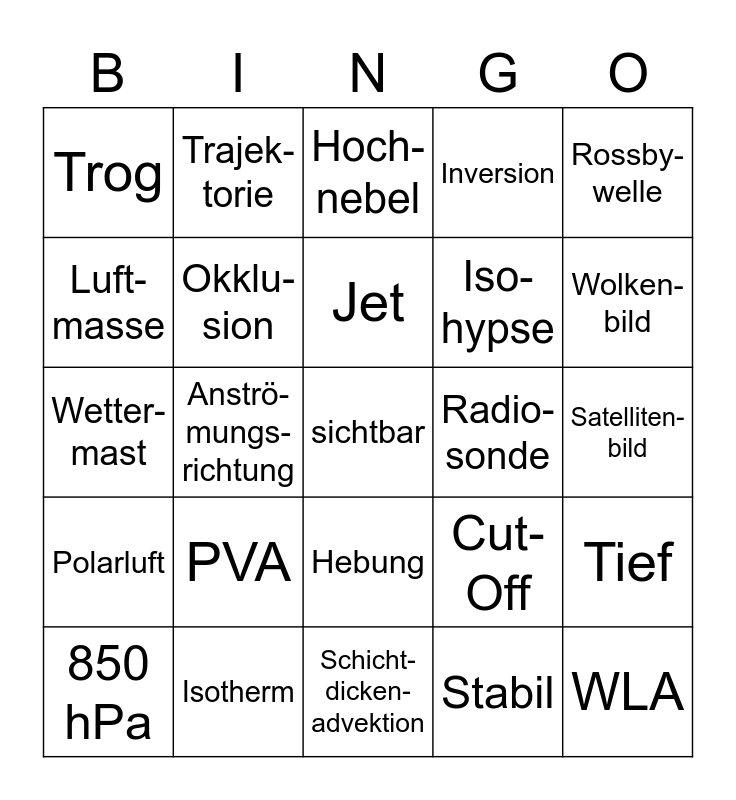 This bingo card has 25 words: PVA, Schicht-dicken-advektion, Jet, 850 hPa, Rossby-welle, Trog, Luft-masse, Trajek-torie, Radio-sonde, Hebung, Iso-hypse, Wetter-mast, Cut-Off, Tief, Okklu-sion, WLA, Satelliten-bild, Hoch-nebel, Wolken-bild, Anströ-mungs-richtung, sichtbar, Isotherm, Polarluft, Inversion and Stabil.