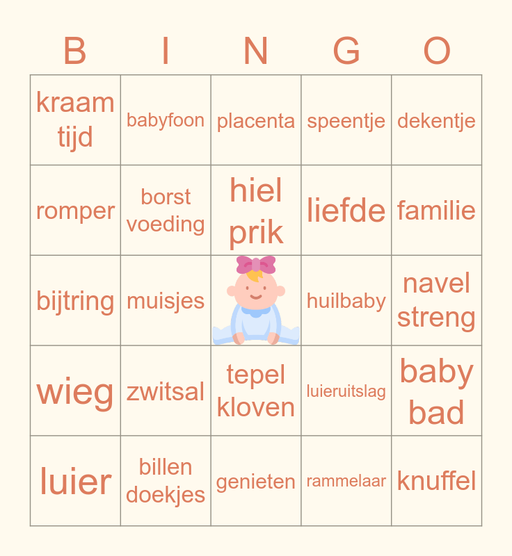 This bingo card has a free space and 62 words: moe, billen doekjes, aankleed kussen, wieg, tummy tub, voedings BH, borst voeding, flesvoeding, liefde, auto stoel, speentje, spuug doekje, romper, bevalling, kraam pakket, kraam tijd, knuffel, dekentje, draagzak, hiel prik, huilbaby, placenta, luier, rammelaar, krampjes, huilen, kraam verzorgster, ledikant, baby bad, ontsluiting, zwanger schap, 40 weken, omslag doek, babytaal, navel streng, babyfoon, bad cape, slab, muisjes, cadeaus, bijtring, kraam verband, zwitsal, schommel stoel, familie, luieruitslag, boertje, fruithapje, slaapgebrek, sprongetje, tepel kloven, genieten, wandel wagen, baarkruk, mama Lieke, papa Stefan, je krijgt er zoveel voor terug!, ze heeft goed gepoept vandaag, eerste woordje, fontanel, vitamine d and harde buiken.