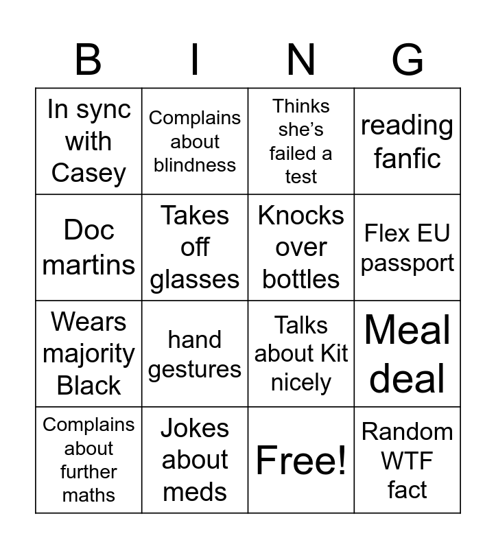 This bingo card has 26 words: Death jokes, Jumping off the library roof, Flex EU passport, Derry Girls, Doc martins, In sync with Casey, Takes off glasses, Complains about blindness, Free!, Cleans glasses, Wears majority Black, Talks about Kit nicely, Insults Kit, Complains about the number of stickers, Meal deal, Chocolate muffin, reading fanfic, Random WTF fact, Thinks she’s failed a test, Complains about further maths, hand gestures, Assert dominance, Jokes about meds, heartstopper, Knocks over bottles and Moves Esther’s folder to the edge of the table.