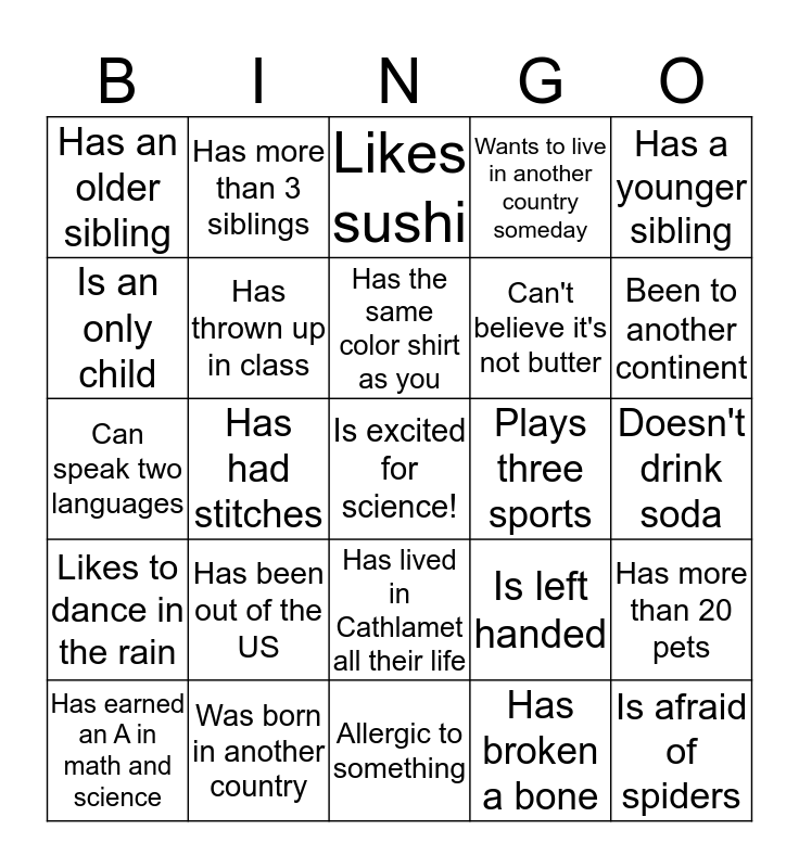 This bingo card has a free space and 24 words: Has been out of the US, Was born in another country, Has the same color shirt as you, Has earned an A in math and science, Has a younger sibling, Has an older sibling, Is an only child, Has more than 3 siblings, Plays three sports, Has lived in Cathlamet all their life, Can't believe it's not butter, Can speak two languages, Is left handed, Has more than 20 pets, Has thrown up in class, Has broken a bone, Doesn't drink soda, Likes sushi, Been to another continent, Has had stitches, Is afraid of spiders, Likes to dance in the rain, Wants to live in another country someday and Allergic to something.
