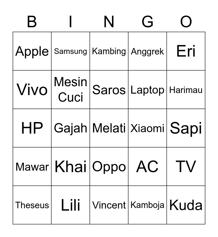 This bingo card has 25 words: Khai, Vincent, Saros, Theseus, Eri, Apple, Vivo, Samsung, Xiaomi, Oppo, Laptop, HP, AC, TV, Mesin Cuci, Kuda, Sapi, Kambing, Harimau, Gajah, Melati, Lili, Mawar, Anggrek and Kamboja.