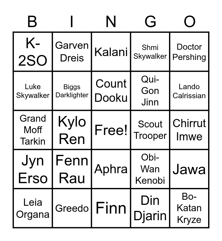 This bingo card has a free space and 91 words: Admiral Ackbar, Anakin Skywalker, Aphra, AT-AT, Barriss Offee, Battle Droids, BB-8, Boba Fett, Bo-Katan Kryze, C-3PO, Cassian Andor, Cham Syndulla, Chewbacca, Chirrut Imwe, Clone Troopers, Count Dooku, Darth Maul, Darth Vader, Depa Billaba, Dak Ralter, Jek Tono Porkins, Ewoks, Finn, General Grievous, Grand Moff Tarkin, Greedo, Lando Calrissian, Han Solo, Jabba the Hutt, Jango Fett, Lightsaber, Jawa, Jedi, Jyn Erso, K-2SO, Shmi Skywalker, Kalani, Kit Fisto, Kylo Ren, Lando Calrissian, Leia Organa, Luke Skywalker, Mace Windu, Mandalorian, Maz Kanata, Obi-Wan Kenobi, Orson Krennic, Owen Lars, Padmé Amidala, Sheev Palpatine, Poe, Qui-Gon Jinn, R2-D2, Rey, Rose Tico, Royal Guards, Scout Trooper, Sixth Brother, Storm Troopers, Yoda, The Phantom Menace, Attack of the Clones, Qi-Ra, Fennec Shand, Greef Garga, Mos Eisley, Grogu, Din Djarin, Rook Kast, Ketsu Onyo, Fenn Rau, Bo-Katan Kryze, Paz Vizsla, Bren Derlin, Garven Dreis, Biggs Darklighter, Wedge Antilles, Lyra Erso, Jyn Erso, Saw Gerrera, Moff Gideon, Doctor Pershing, Rise of Skywalker, Solo: A Star Wars Story, The Last Jedi, Rogue One, The Force Awakens, Return of the Jedi, Empire Strikes Back, A New Hope and Revenge of the Sith.