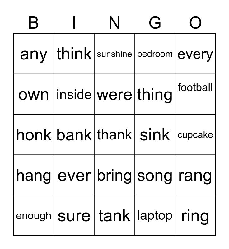 This bingo card has a free space and 24 words: ever, sure, were, enough, every, any, own, think, sink, bring, thing, honk, song, rang, inside, laptop, cupcake, sunshine, football, bank, ring, hang, bedroom and tank.