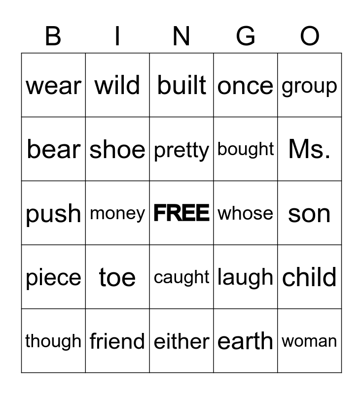 This bingo card has a free space and 39 words: neither, Mrs., done, shoe, though, caught, pretty, whole, group, piece, money, once, woman, son, whose, toe, Mr., wear, heart, laugh, bear, either, bought, Ms., Miss, blue, love, climb, even, wild, picture, carry, built, friend, earth, English, child, push and women.