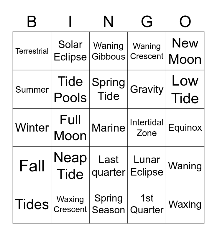 This bingo card has a free space and 24 words: Neap Tide, Waxing Crescent, Spring Tide, Tides, New Moon, Terrestrial, Summer, Solar Eclipse, Intertidal Zone, Last quarter, Gravity, Winter, Lunar Eclipse, Waning, Tide Pools, 1st Quarter, Equinox, Waning Gibbous, Low Tide, Full Moon, Waxing, Fall, Waning Crescent and Spring Season.