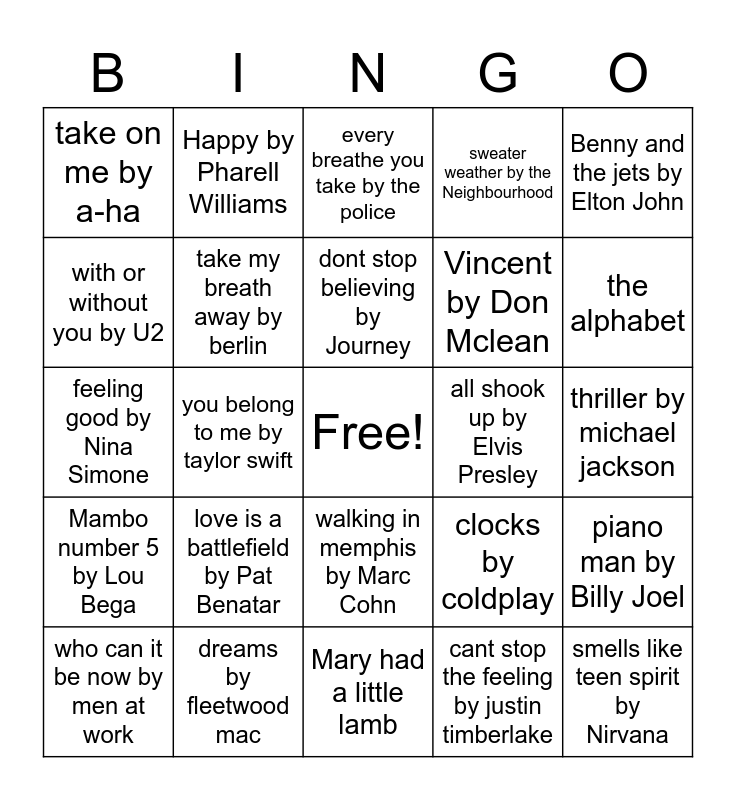 This bingo card has a free space and 29 words: who can it be now by men at work, I just died in your arms tonight by cutting crew, you belong to me by taylor swift, dont dream its over by crowded house, take on me by a-ha, every breathe you take by the police, take my breath away by berlin, love is a battlefield by Pat Benatar, all shook up by Elvis Presley, dreams by fleetwood mac, thriller by michael jackson, smells like teen spirit by Nirvana, Mary had a little lamb, cant stop the feeling by justin timberlake, the alphabet, forever young by alphaville, walking in memphis by Marc Cohn, Mambo number 5 by Lou Bega, Benny and the jets by Elton John, feeling good by Nina Simone, clocks by coldplay, Fast Car by Tracy Chapman, Vincent by Don Mclean, with or without you by U2, sweater weather by the Neighbourhood, Happy by Pharell Williams, piano man by Billy Joel, dont stop believing by Journey and Happy Birthday.