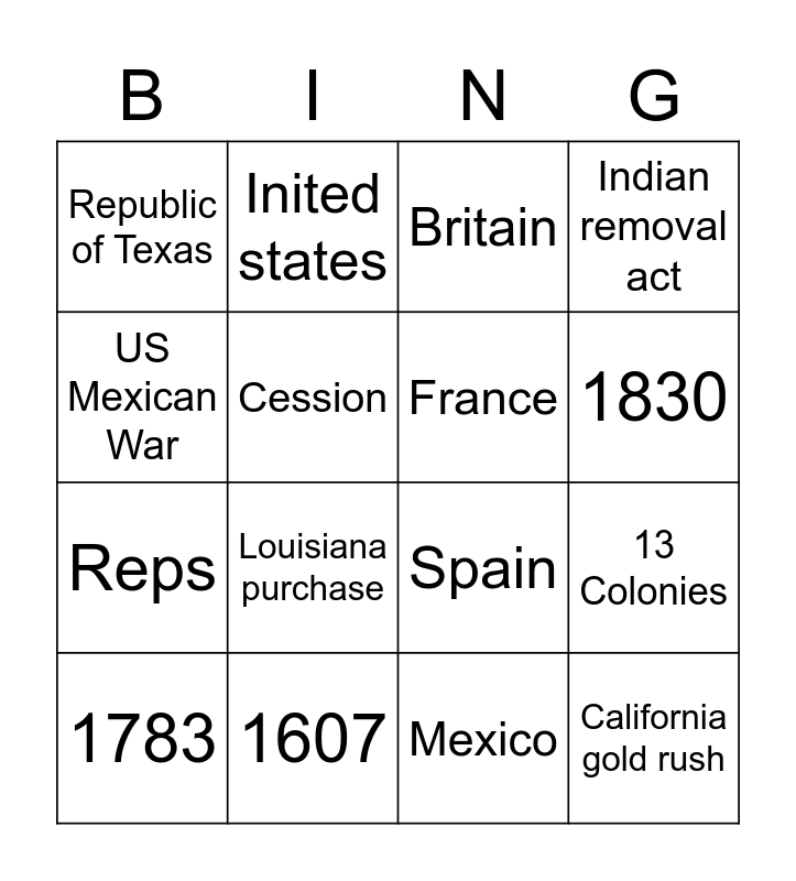 This bingo card has 16 words: 1607, 13 Colonies, Britain, Republic of Texas, Reps, Inited states, Spain, Mexico, US Mexican War, Cession, 1783, Indian removal act, Louisiana purchase, 1830, France and California gold rush.