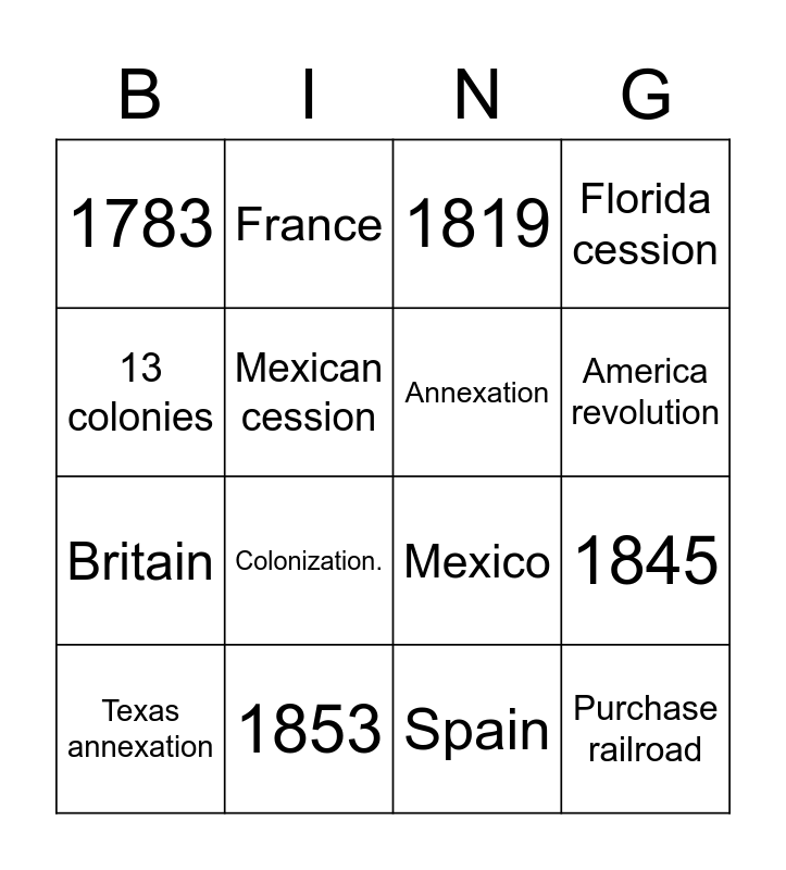 This bingo card has 16 words: 1853, 1845, 1819, 1783, Britain, France, Mexico, Spain, 13 colonies, Mexican cession, Texas annexation, Florida cession, Colonization., America revolution, Annexation and Purchase railroad.