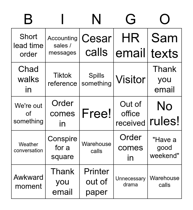 This bingo card has a free space and 27 words: Order comes in, Chad walks in, Visitor, Printer out of paper, Chad walks in, Cesar calls, Accounting sales / messages, Weather conversation, Out of office received, "Have a good weekend", We're out of something, HR email, Awkward moment, Thank you email, Thank you email, Song / movie reference, Tiktok reference, Spills something, Conspire for a square, Short lead time order, No rules!, Unnecessary drama, Order comes in, Warehouse calls, Warehouse calls, Sam texts and Fletchy pee break.