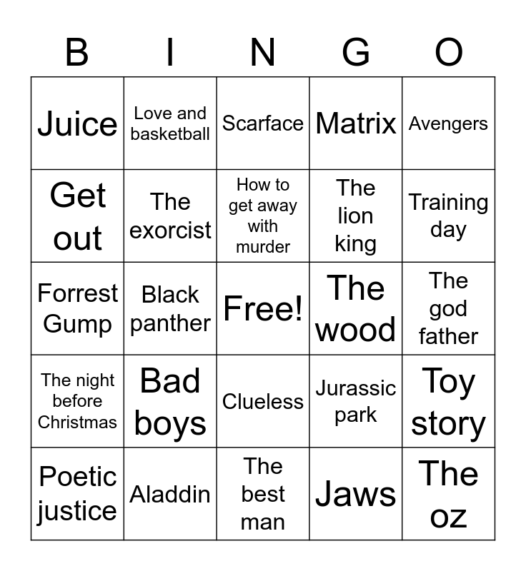 This bingo card has a free space and 24 words: Bad boys, Aladdin, How to get away with murder, Poetic justice, Avengers, Juice, Get out, Love and basketball, The wood, Clueless, The lion king, Forrest Gump, Jurassic park, Toy story, The exorcist, Jaws, The god father, Scarface, Training day, Black panther, The oz, The night before Christmas, Matrix and The best man.
