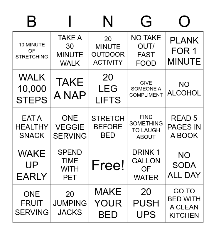 This bingo card has 26 words: Free!, 20 PUSH UPS, 20 LEG LIFTS, 20 JUMPING JACKS, PLANK FOR 1 MINUTE, 10 MINUTE OF STRETCHING, WALK 10,000 STEPS, TAKE A 30 MINUTE WALK, READ 5 PAGES IN A BOOK, DRINK 1 GALLON OF WATER, GIVE SOMEONE A COMPLIMENT, EAT A HEALTHY SNACK, NO SODA ALL DAY, ONE FRUIT SERVING, ONE VEGGIE SERVING, NO SWEETS ALL DAY, NO TAKE OUT/ FAST FOOD, WAKE UP EARLY, 20 MINUTE OUTDOOR ACTIVITY, STRETCH BEFORE BED, NO ALCOHOL, MAKE YOUR BED, FIND SOMETHING TO LAUGH ABOUT, SPEND TIME WITH PET, TAKE A NAP and GO TO BED WITH A CLEAN KITCHEN.