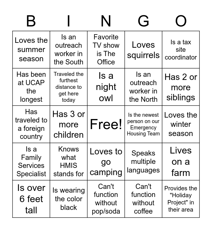 This bingo card has a free space and 24 words: Knows what HMIS stands for, Is wearing the color black, Is a night owl, Is over 6 feet tall, Is a tax site coordinator, Loves the summer season, Has been at UCAP the longest, Is an outreach worker in the South, Is the newest person on our Emergency Housing Team, Loves to go camping, Is an outreach worker in the North, Has traveled to a foreign country, Speaks multiple languages, Lives on a farm, Traveled the furthest distance to get here today, Can't function without coffee, Loves the winter season, Favorite TV show is The Office, Has 2 or more siblings, Has 3 or more children, Provides the "Holiday Project" in their area, Is a Family Services Specialist, Loves squirrels and Can't function without pop/soda.