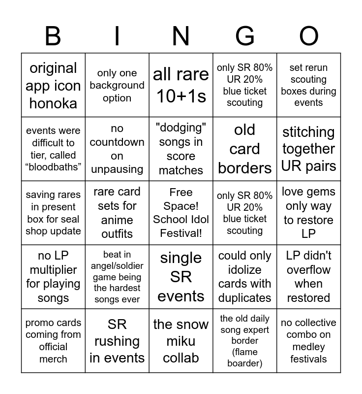 This bingo card has a free space and 24 words: beat in angel/soldier game being the hardest songs ever, SR rushing in events, "dodging" songs in score matches, promo cards coming from official merch, set rerun scouting boxes during events, original app icon honoka, events were difficult to tier, called “bloodbaths”, only one background option, only SR 80% UR 20% blue ticket scouting, single SR events, old card borders, saving rares in present box for seal shop update, could only idolize cards with duplicates, LP didn't overflow when restored, no countdown on unpausing, the old daily song expert border (flame boarder), love gems only way to restore LP, all rare 10+1s, stitching together UR pairs, rare card sets for anime outfits, no collective combo on medley festivals, no LP multiplier for playing songs, only SR 80% UR 20% blue ticket scouting and the snow miku collab.