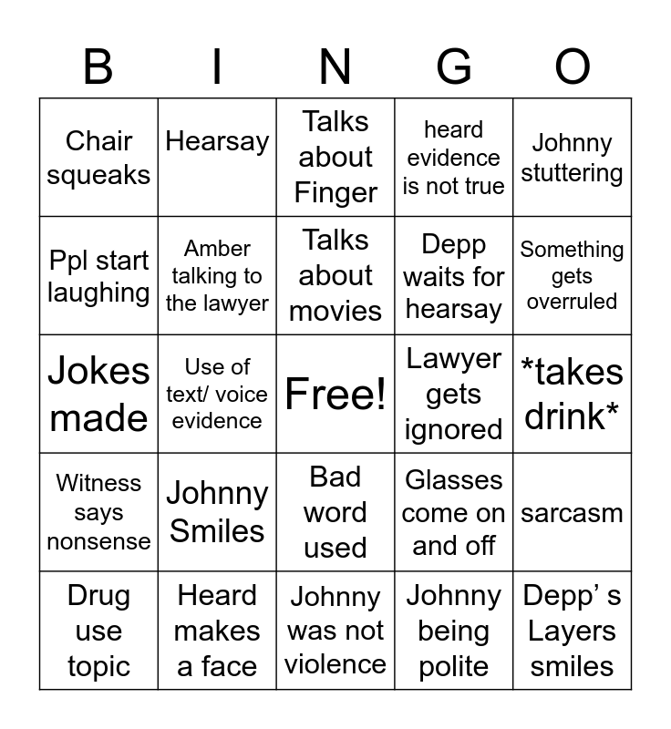 This bingo card has a free space and 24 words: Johnny Smiles, Heard makes a face, Talks about movies, Drug use topic, Johnny stuttering, Chair squeaks, Ppl start laughing, Hearsay, Lawyer gets ignored, Bad word used, Depp waits for hearsay, Jokes made, Glasses come on and off, sarcasm, Amber talking to the lawyer, Johnny being polite, *takes drink*, Talks about Finger, Something gets overruled, Use of text/ voice evidence, Depp’ s Layers smiles, Witness says nonsense, heard evidence is not true and Johnny was not violence.