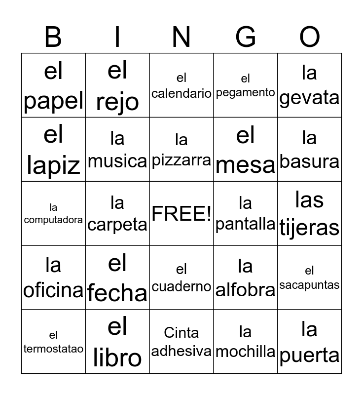 This bingo card has a free space and 24 words: el fecha, el libro, la pizzarra, el termostatao, la gevata, el papel, el lapiz, el rejo, la pantalla, el cuaderno, el mesa, la computadora, la alfobra, el sacapuntas, la musica, la mochilla, las tijeras, el calendario, la basura, la carpeta, la puerta, la oficina, el pegamento and Cinta adhesiva.