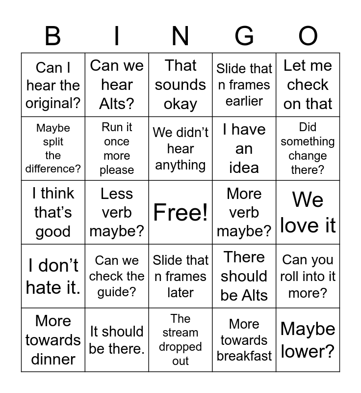 This bingo card has a free space and 24 words: Can we check the guide?, It should be there., We didn’t hear anything, More towards dinner, Let me check on that, Can I hear the original?, Maybe split the difference?, Can we hear Alts?, More verb maybe?, Slide that n frames later, I have an idea, I think that’s good, There should be Alts, Can you roll into it more?, Run it once more please, More towards breakfast, We love it, That sounds okay, Did something change there?, Less verb maybe?, Maybe lower?, I don’t hate it., Slide that n frames earlier and The stream dropped out.