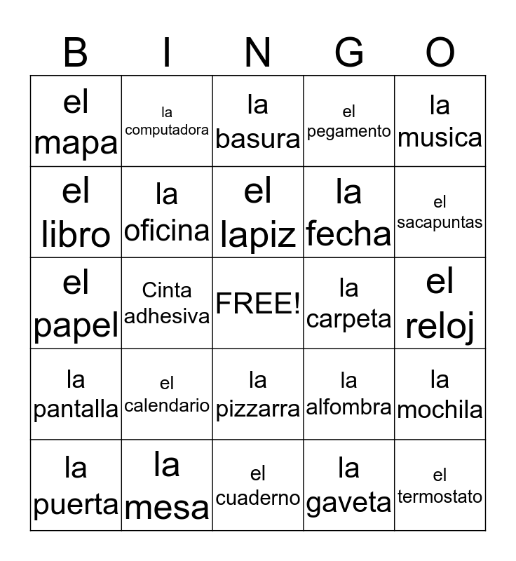 This bingo card has a free space and 24 words: el calendario, la mesa, el lapiz, la puerta, la musica, el mapa, el libro, la computadora, la carpeta, la pizzarra, la fecha, el papel, la alfombra, la mochila, la oficina, la gaveta, el reloj, la basura, el sacapuntas, Cinta adhesiva, el termostato, la pantalla, el pegamento and el cuaderno.