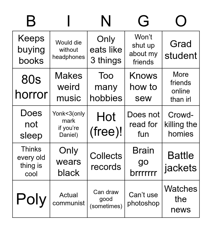 This bingo card has a free space and 24 words: Only wears black, Actual communist, Too many hobbies, Poly, Grad student, Keeps buying books, 80s horror, Would die without headphones, Does not read for fun, Collects records, Knows how to sew, Does not sleep, Brain go brrrrrrr, Battle jackets, Makes weird music, Can’t use photoshop, Crowd- killing the homies, Only eats like 3 things, More friends online than irl, Yonk<3(only mark if you’re Daniel), Watches the news, Thinks every old thing is cool, Won’t shut up about my friends and Can draw good (sometimes).