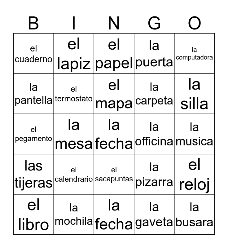 This bingo card has a free space and 24 words: el calendrario, la mochila, el mapa, el libro, la computadora, el cuaderno, la pantella, el lapiz, la officina, el sacapuntas, la carpeta, el pegamento, la pizarra, el reloj, el termostato, la gaveta, la musica, el papel, la silla, la mesa, la busara, las tijeras, la puerta and la fecha.