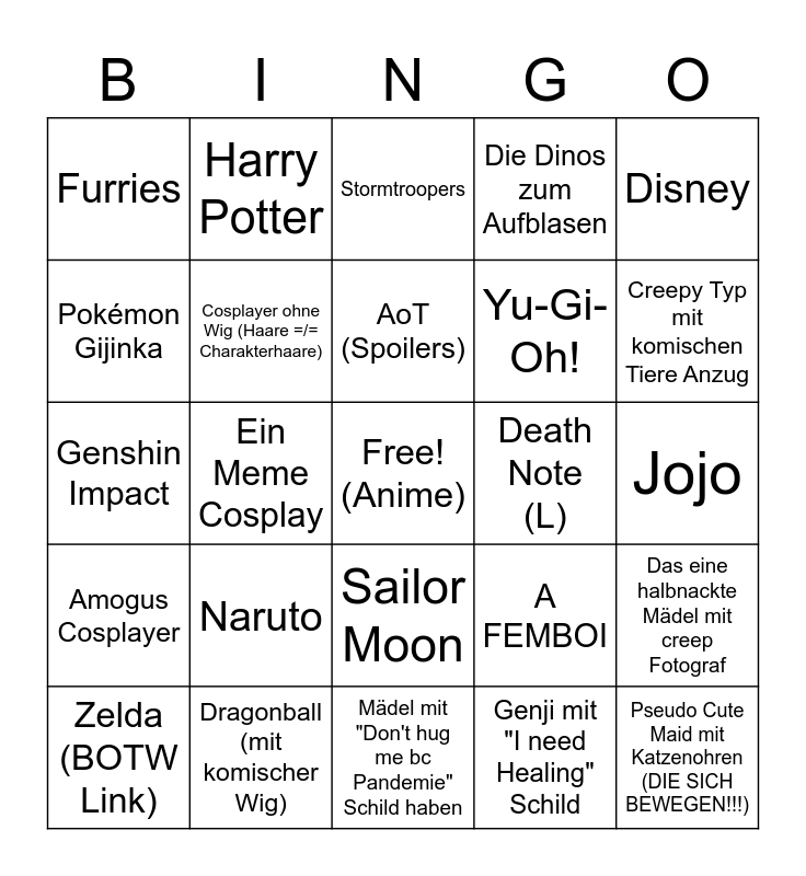 This bingo card has a free space and 24 words: Naruto, Dragonball (mit komischer Wig), AoT (Spoilers), Zelda (BOTW Link), Disney, Furries, Pokémon Gijinka, Harry Potter, Death Note (L), Sailor Moon, Yu-Gi-Oh!, Genshin Impact, A FEMBOI, Das eine halbnackte Mädel mit creep Fotograf, Cosplayer ohne Wig (Haare =/= Charakterhaare), Genji mit "I need Healing" Schild, Jojo, Stormtroopers, Creepy Typ mit komischen Tiere Anzug, Ein Meme Cosplay, Pseudo Cute Maid mit Katzenohren (DIE SICH BEWEGEN!!!), Amogus Cosplayer, Die Dinos zum Aufblasen and Mädel mit "Don't hug me bc Pandemie" Schild haben.