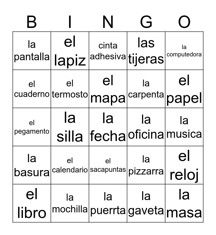 This bingo card has a free space and 24 words: el calendario, la mochilla, el mapa, el libro, la computedora, la pantalla, el cuaderno, el lapiz, la oficina, el sacapuntas, la carpenta, el pegamento, la pizzarra, el reloj, el termosto, la gaveta, la musica, cinta adhesiva, el papel, la silla, la masa, la basura, las tijeras and la puerrta.