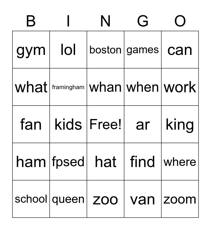 This bingo card has a free space and 29 words: school, lunch, kids, fun, gym, boston, framingham, fpsed, ar, queen, king, zoom, zoo, van, work, math, hat, ham, can, fan, find, jelly, when, what, games, lol, where, whan and were.