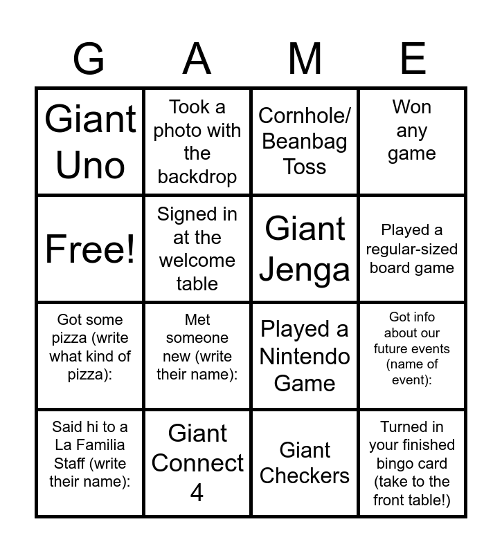 This bingo card has 16 words: Giant Connect 4, Got info about our future events (name of event):, Cornhole/ Beanbag Toss, Giant Uno, Got some pizza (write what kind of pizza):, Took a photo with the backdrop, Played a Nintendo Game, Giant Checkers, Free!, Signed in at the welcome table, Said hi to a La Familia Staff (write their name):, Won any game, Met someone new (write their name):, Played a regular-sized board game, Giant Jenga and Turned in your finished bingo card (take to the front table!).