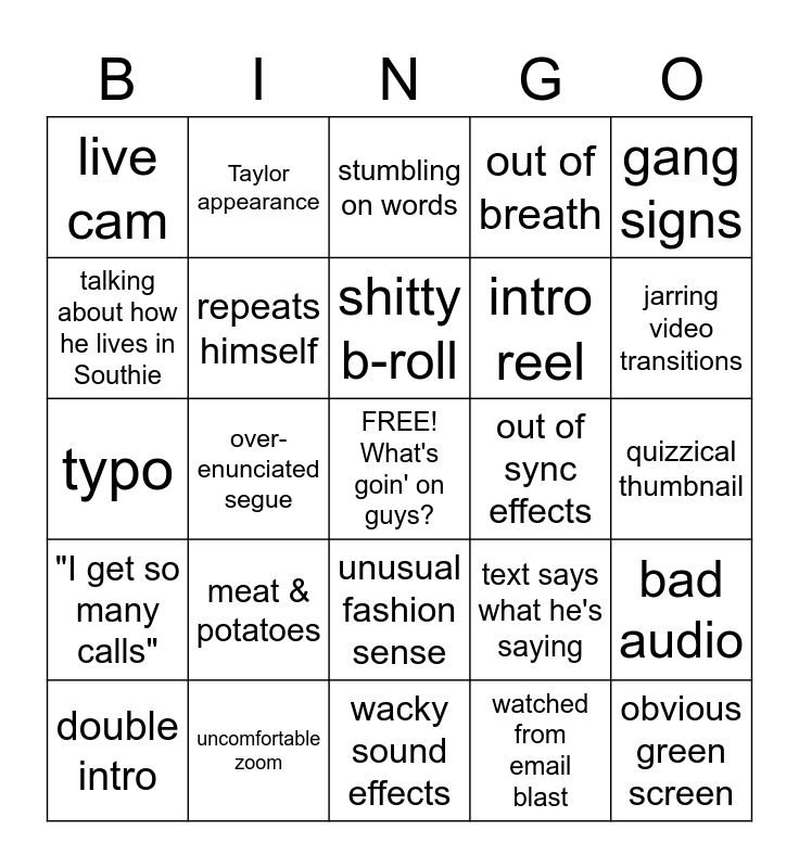 This bingo card has a free space and 24 words: meat & potatoes, uncomfortable zoom, shitty b-roll, double intro, gang signs, live cam, talking about how he lives in Southie, Taylor appearance, out of sync effects, unusual fashion sense, intro reel, typo, text says what he's saying, bad audio, repeats himself, watched from email blast, quizzical thumbnail, stumbling on words, jarring video transitions, over-enunciated segue, obvious green screen, "I get so many calls", out of breath and wacky sound effects.