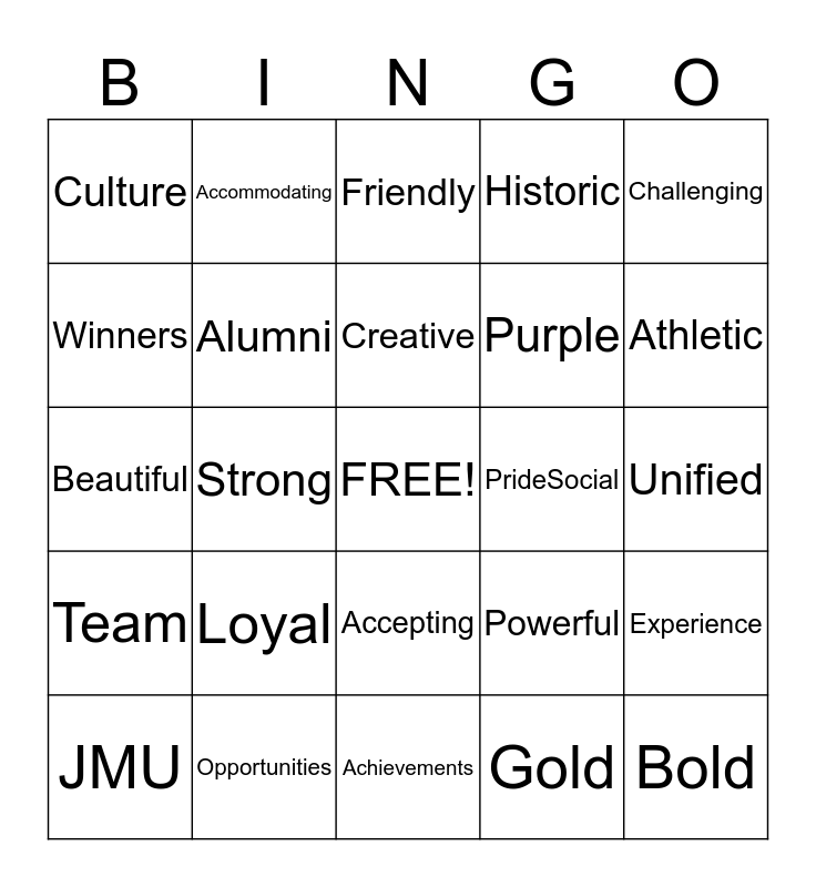 This bingo card has a free space and 28 words: Experience, Duke, Purple, Gold, Winners, Friendly, Accommodating, Team, PrideSocial, JMU, Beautiful, Historic, Opportunities, Achievements, Athletic, Community, Loyal, Alumni, Creative, Accepting, Culture, Heart, Bold, Strong, Unified, Powerful, Challenging and Generous.