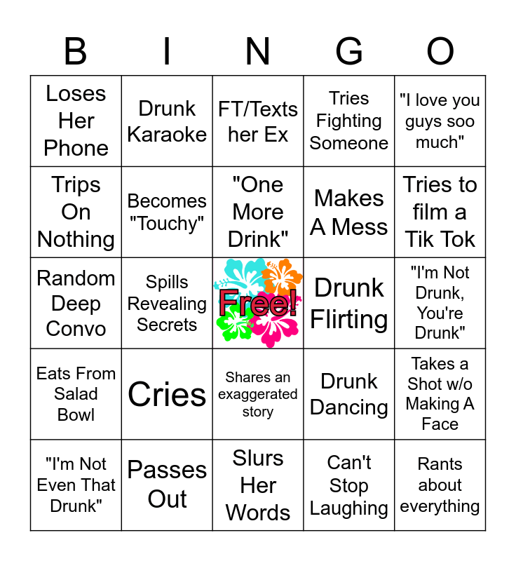 This bingo card has a free space and 27 words: Drunk Dancing, Throws Up, Makes A Mess, Slurs Her Words, Trips On Nothing, FT/Texts her Ex, Drunk Karaoke, Eats From Salad Bowl, Drunk Flirting, Takes a Shot w/o Making A Face, Random Deep Convo, Tries Fighting Someone, "I'm Not Even That Drunk", Passes Out, Tries to film a Tik Tok, Gets Buzzed From 1 Drink, Becomes "Touchy", "One More Drink", Cries, Loses Her Phone, "I'm Not Drunk, You're Drunk", Can't Stop Laughing, Spills Revealing Secrets, Rants about everything, Shares an exaggerated story, "I love you guys soo much" and Spills Her Drink.