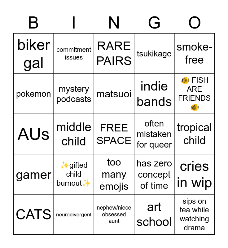 This bingo card has a free space and 24 words: ✨gifted child burnout✨, neurodivergent, matsuoi, CATS, smoke-free, biker gal, pokemon, commitment issues, often mistaken for queer, too many emojis, indie bands, AUs, has zero concept of time, cries in wip, mystery podcasts, art school, tropical child, RARE PAIRS, 🐠 FISH ARE FRIENDS 🐠, middle child, sips on tea while watching drama, gamer, tsukikage and nephew/niece obsessed aunt.