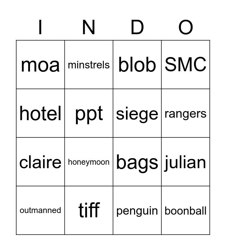 This bingo card has 28 words: indo, hax, claire, kdr, ppt, blob, minstrels, boonball, tiff, farmed, bags, SMC, spawncamping, mapqueue, honeymoon, spy, golems, siege, rangers, pinsnipe, moa, stomped, outmanned, julian, penguin, celsith, hotel and cummies.