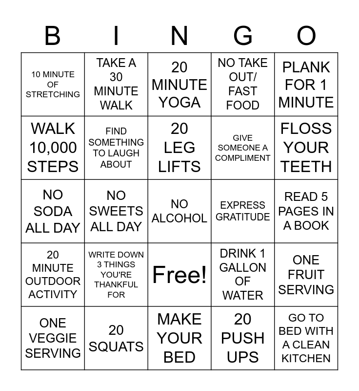 This bingo card has 26 words: Free!, 20 PUSH UPS, 20 LEG LIFTS, 20 SQUATS, PLANK FOR 1 MINUTE, 10 MINUTE OF STRETCHING, WALK 10,000 STEPS, TAKE A 30 MINUTE WALK, READ 5 PAGES IN A BOOK, DRINK 1 GALLON OF WATER, GIVE SOMEONE A COMPLIMENT, NO SODA ALL DAY, ONE FRUIT SERVING, ONE VEGGIE SERVING, NO SWEETS ALL DAY, HOLD THE DOOR OPEN FOR SOMEONE, NO TAKE OUT/ FAST FOOD, 20 MINUTE OUTDOOR ACTIVITY, 20 MINUTE YOGA, NO ALCOHOL, FLOSS YOUR TEETH, MAKE YOUR BED, EXPRESS GRATITUDE, WRITE DOWN 3 THINGS YOU'RE THANKFUL FOR, FIND SOMETHING TO LAUGH ABOUT and GO TO BED WITH A CLEAN KITCHEN.