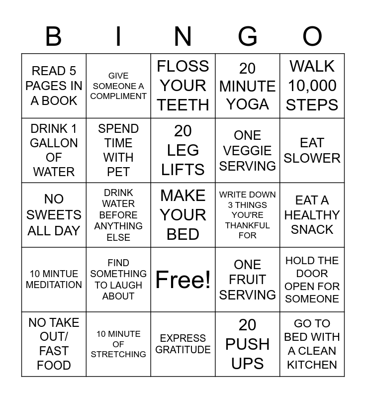 This bingo card has 26 words: Free!, 20 PUSH UPS, 20 LEG LIFTS, 10 MINUTE OF STRETCHING, WALK 10,000 STEPS, READ 5 PAGES IN A BOOK, DRINK 1 GALLON OF WATER, GIVE SOMEONE A COMPLIMENT, EAT A HEALTHY SNACK, ONE FRUIT SERVING, ONE VEGGIE SERVING, NO SWEETS ALL DAY, HOLD THE DOOR OPEN FOR SOMEONE, NO TAKE OUT/ FAST FOOD, DRINK WATER BEFORE ANYTHING ELSE, STRETCH BEFORE BED, 20 MINUTE YOGA, 10 MINTUE MEDITATION, FLOSS YOUR TEETH, MAKE YOUR BED, EAT SLOWER, EXPRESS GRATITUDE, WRITE DOWN 3 THINGS YOU'RE THANKFUL FOR, FIND SOMETHING TO LAUGH ABOUT, SPEND TIME WITH PET and GO TO BED WITH A CLEAN KITCHEN.