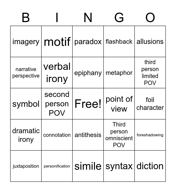 This bingo card has a free space and 24 words: connotation, personification, epiphany, juxtaposition, allusions, imagery, narrative perspective, motif, point of view, antithesis, metaphor, symbol, Third person omniscient POV, foreshadowing, verbal irony, syntax, foil character, paradox, third person limited POV, second person POV, diction, dramatic irony, flashback and simile.