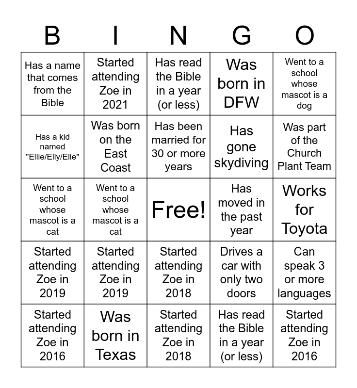 This bingo card has a free space and 49 words: Was part of the Church Plant Team, Started attending Zoe in 2016, Started attending Zoe in 2017, Started attending Zoe in 2018, Started attending Zoe in 2019, Started attending Zoe in 2020, Started attending Zoe in 2021, Started attending Zoe in 2022, Has a kid named "Ellie/Elly/Elle", Was born in Texas, Was born on the East Coast, Was born in DFW, Can speak 3 or more languages, Drives a car with only two doors, Works for Toyota, Travels 30 miles or more to church, Has been married for 30 or more years, Has moved in the past year, Has more than 4 kids, Went to a school whose mascot is a dog, Went to a school whose mascot is a cat, Has read the Bible in a year (or less), Has a name that comes from the Bible, Has gone skydiving, Attends church with their children AND parents, Was part of the Church Plant Team, Started attending Zoe in 2016, Started attending Zoe in 2017, Started attending Zoe in 2018, Started attending Zoe in 2019, Started attending Zoe in 2020, Started attending Zoe in 2021, Started attending Zoe in 2022, Has a kid named "Ellie/Elly/Elle", Was born in Texas, Was born in DFW, Can speak 3 or more languages, Drives a car with only two doors, Works for Toyota, Travels 30 miles or more to church, Has been married for 30 or more years, Has moved in the past year, Has more than 4 kids, Went to a school whose mascot is a dog, Went to a school whose mascot is a cat, Has read the Bible in a year (or less), Has a name that comes from the Bible, Has gone skydiving and Attends church with their children AND parents.
