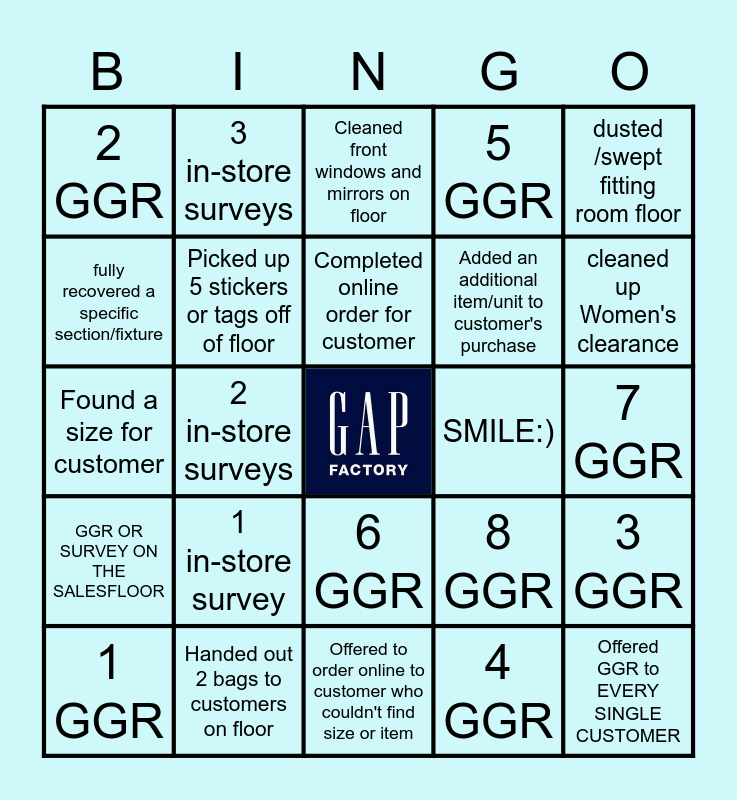 This bingo card has a free space and 24 words: 1 in-store survey, Handed out 2 bags to customers on floor, Completed online order for customer, 1 GGR, dusted /swept fitting room floor, 2 GGR, fully recovered a specific section/fixture, 3 in-store surveys, SMILE:), 6 GGR, Added an additional item/unit to customer's purchase, Found a size for customer, 8 GGR, 3 GGR, Picked up 5 stickers or tags off of floor, 4 GGR, 7 GGR, Cleaned front windows and mirrors on floor, cleaned up Women's clearance, 2 in-store surveys, Offered GGR to EVERY SINGLE CUSTOMER, GGR OR SURVEY ON THE SALESFLOOR, 5 GGR and Offered to order online to customer who couldn't find size or item.